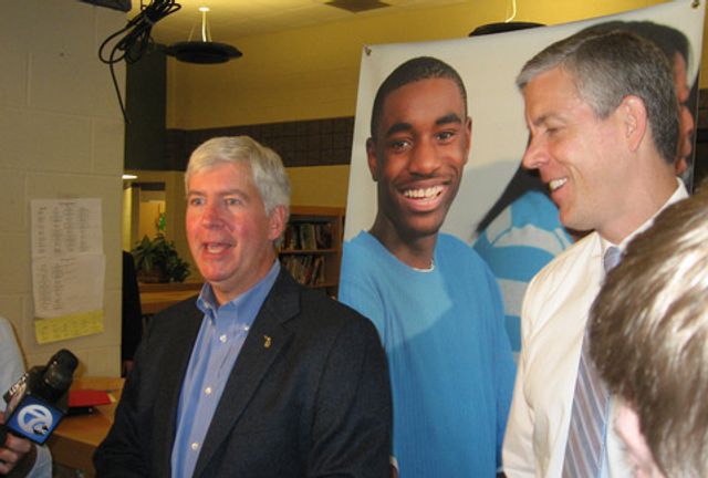 Rick Snyder and former Obama education secretary Arne Duncan in 2013