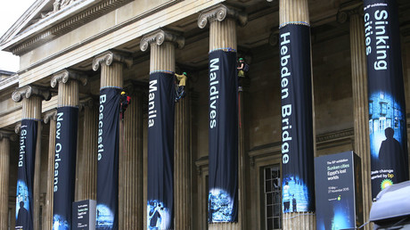 Greenpeace activists have scaled the columns of the British Museum in central London in protest against oil giant BP’s sponsorship of a new ‘Sunken Cities’ exhibition.