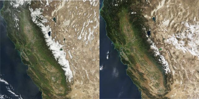 NASA satellite images of Sierra Nevada snowpack, March 2010 and March 2015
