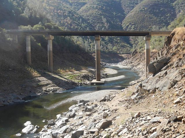 Tuolumne River in 2014. The break in colors on the pillars indicate normal river height.